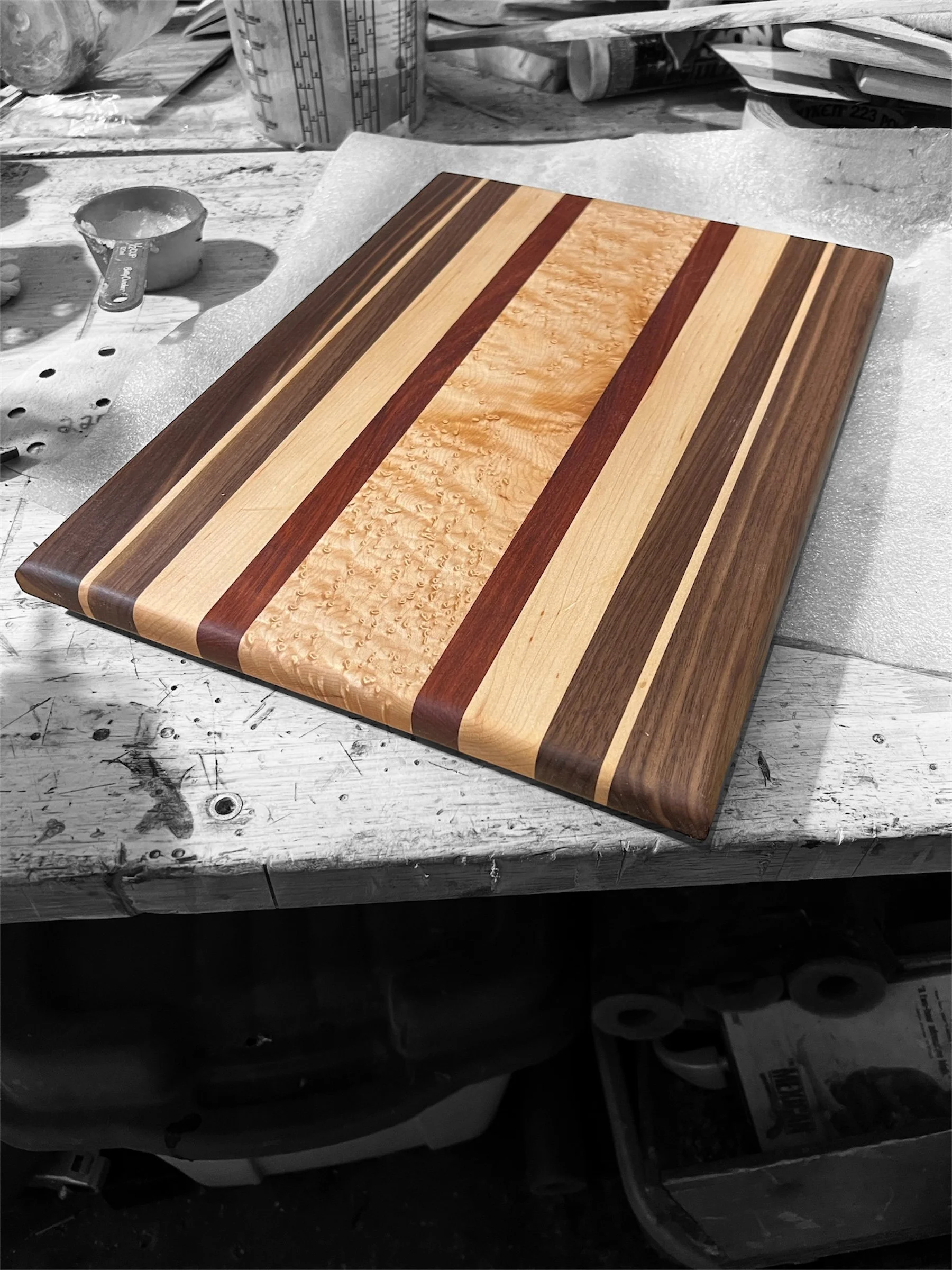 Categories: All Cutting Boards Cribbage Boards Charcuterie Boards Games All / Luxury Multi-Wood Cutting Board — 12” x 18” $130.00 Walnut & Maple “Brick Pattern” Cutting Board $165.00 12x18" Padauk, Walnut & Maple Cutting Board Sale Price: $150.00 Original Price: $165.00 Sale